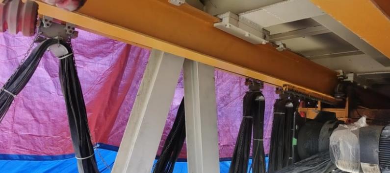 4、調(diào)整牽引鋼絲繩,工字鋼滑車使其長度小于同節(jié)電纜長度,運(yùn)行時由牽引鋼絲繩受力。